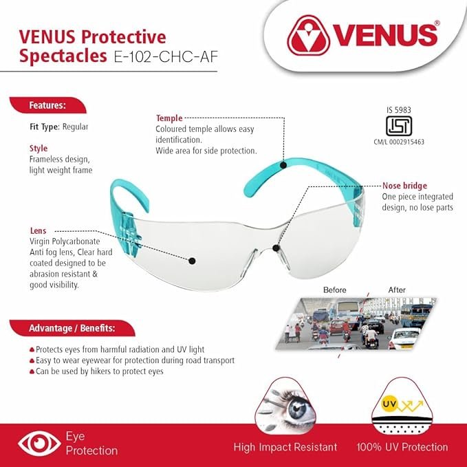 Be the first to review “VENUS Safety Goggles E102 Safety Eyewear ISI Certified Anti Scratch Protection Dust Clear Lens” Cancel reply